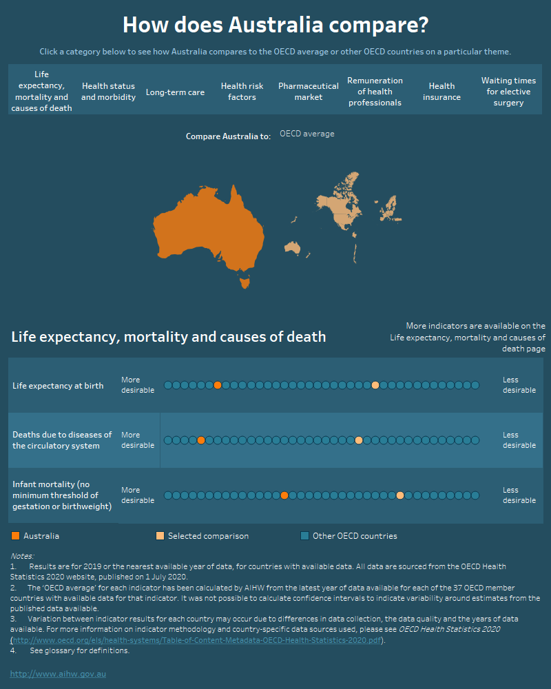 The visualisation on this page provides a snapshot of Australia’s health and health care performance in comparison with the OECD average and with other OECD countries.